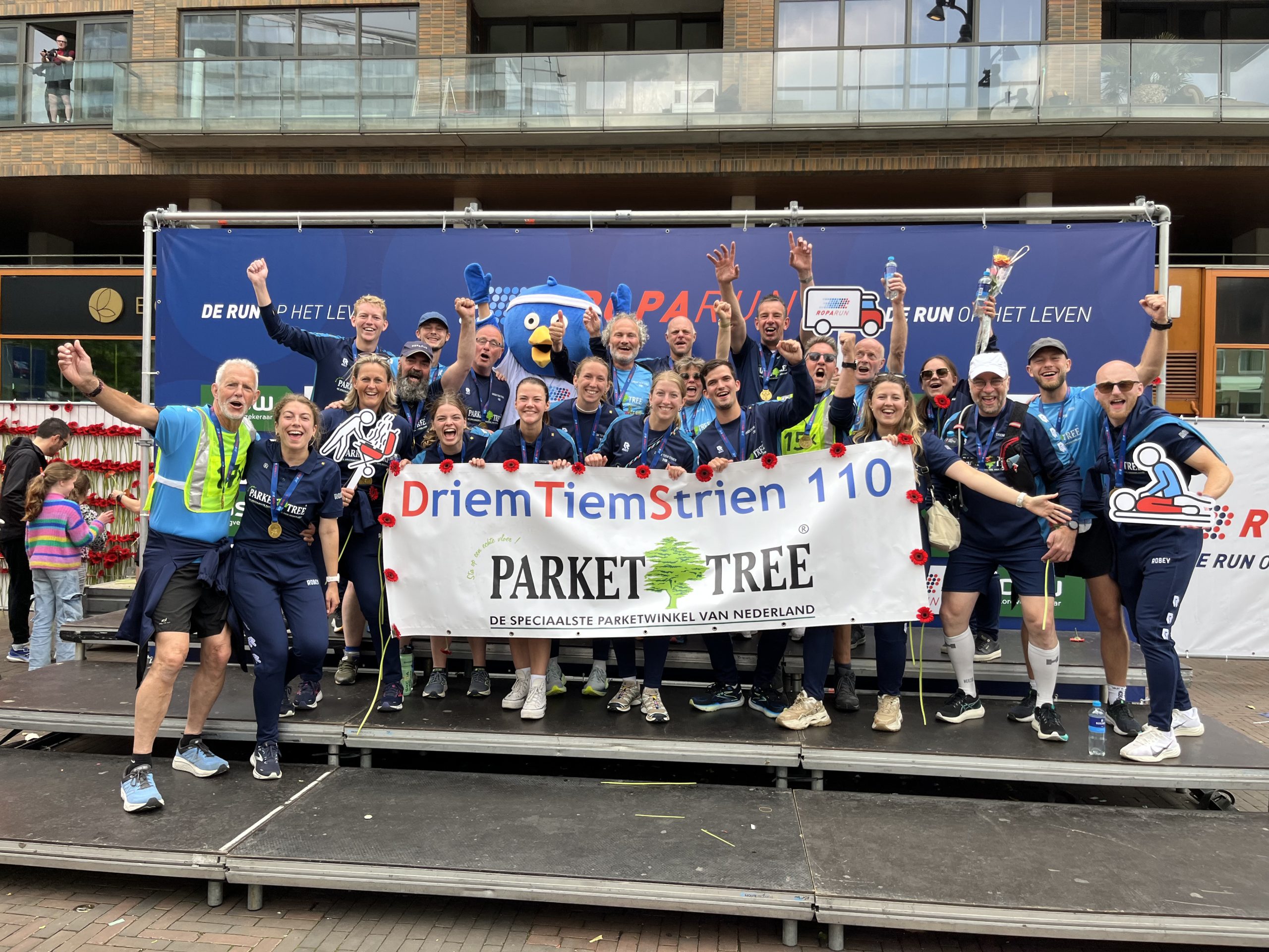 Ondertussen bestaat het team niet meer alleen uit Strijenaren en zijn de witte en gele shirts vervangen door het bekende blauwe tenues. Komende edities lopen we in nieuwe teamkleding met als hoofdsponsor Parkettree.